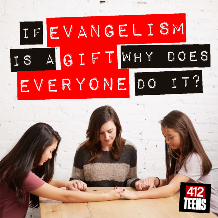 So, for some, evangelism may be an actual career—a vocational or bi-vocational calling. Missionaries travel abroad to reach those who have no chance of hearing about Jesus. Locally, outreach ministers share Jesus's offer with the unhoused, prisoners, home-bound, and anyone they meet. Digitally, we at 412teens and Got Questions Ministries share God's truth online to whoever can access our resources.